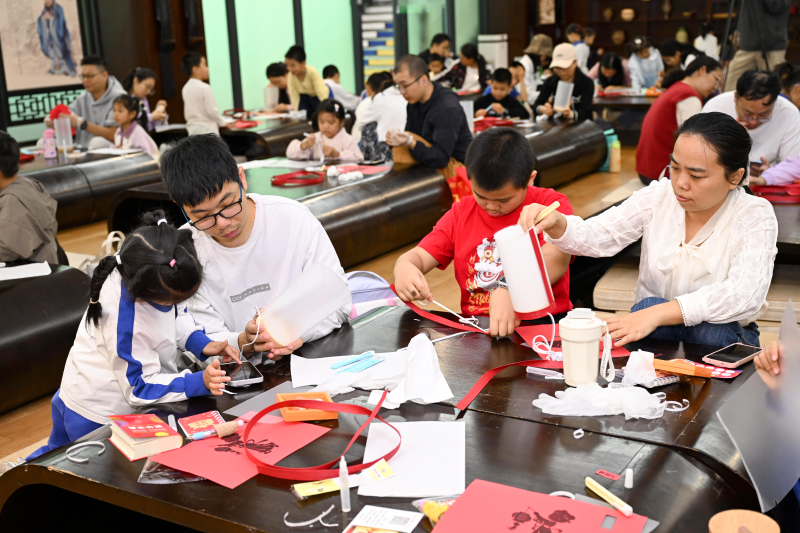 手工体验区内,欢声笑语与纸墨清香交织,一派温馨景象。家长与孩子们围坐在长桌旁,或执剪裁红,或拼贴骨架,各展巧思,其乐融融。