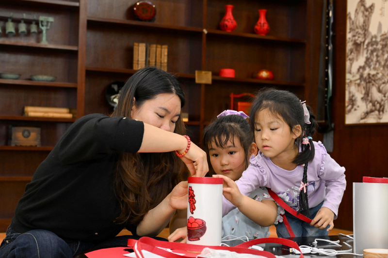 靠近窗边的一角,几组亲子家庭正专注于剪纸灯的创作。孩子们小手紧握剪刀,在父母的轻声指导下,沿着画好的纹路小心翼翼地游走,寓意吉祥的如意纹、象征福气的“福”字渐次成形。随后,这些精美的剪纸被轻轻贴在素色的灯骨上,普通的灯笼顿时有了灵气——每一刀剪痕都透着匠心,每一处镂空都藏着祝福。而在另一侧,制作古韵花灯的孩子们则沉浸在拼接与装饰的乐趣中。父母帮忙扶着骨架,孩子认真地涂抹胶水,将裁好的绢纸一点点糊上去,一盏盏传统的宫灯在亲子协作中悄然诞生。